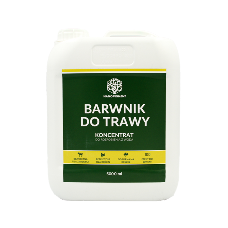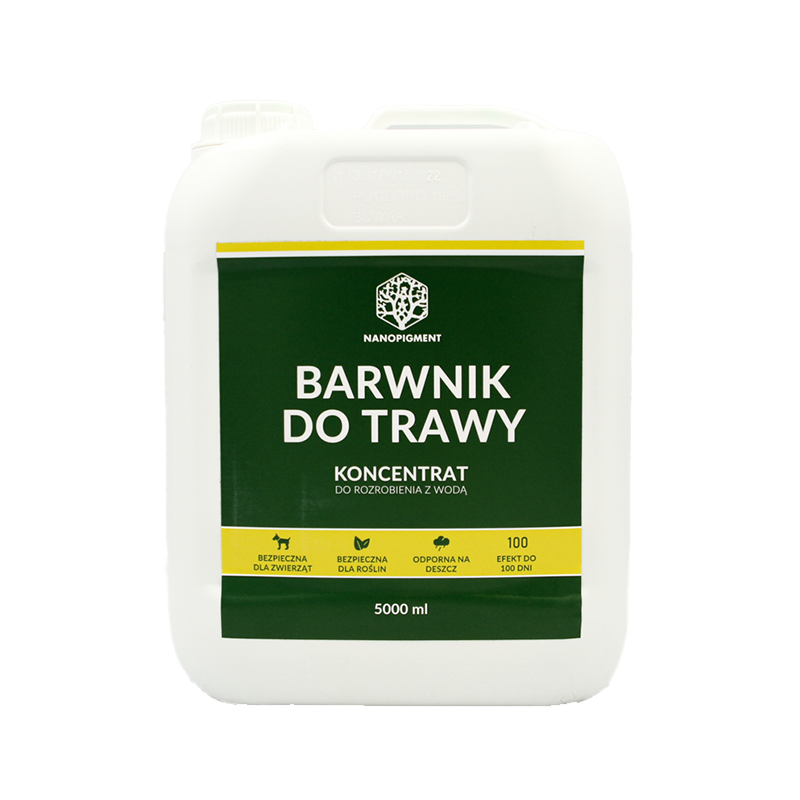 Nanopigment barwnik do trawy zielony – koncentrat 5000 ml to profesjonalny pigment wodny przeznaczony do barwienia i przywracania koloru trawy oraz muraw. Koncentrat został stworzony specjalnie z myślą o uzyskaniu intensywnej, głębokiej zieleni, która wygląda naturalnie i estetycznie, a jednocześnie jest trwała i odporna na warunki atmosferyczne po wyschnięciu.