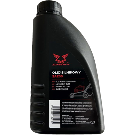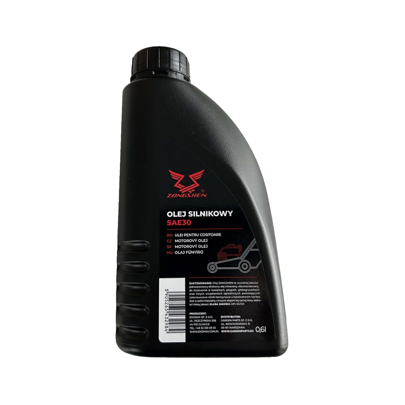 Oryginalny olej silnikowy Zongshen SAE 30 (0,6 L) to wysokiej jakości produkt przeznaczony do czterosuwowych silników kosiarek spalinowych oraz innych maszyn ogrodowych. Olej o lepkości SAE 30 zapewnia doskonałe smarowanie elementów ruchomych, redukcję tarcia i ochronę przeciwdziałającą zużyciu, co wpływa na stabilną, niezawodną pracę silnika i dłuższą żywotność jednostki napędowej. Produkt w wygodnej butelce 0,6 L jest gotowy do montażu podczas serwisowania lub wymiany oleju.